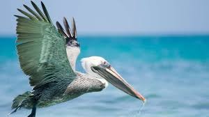 Pelicans are large water birds with a long beak and large throat pouch used to catch prey. You can see them flying in formation just over the water or diving for fish.
